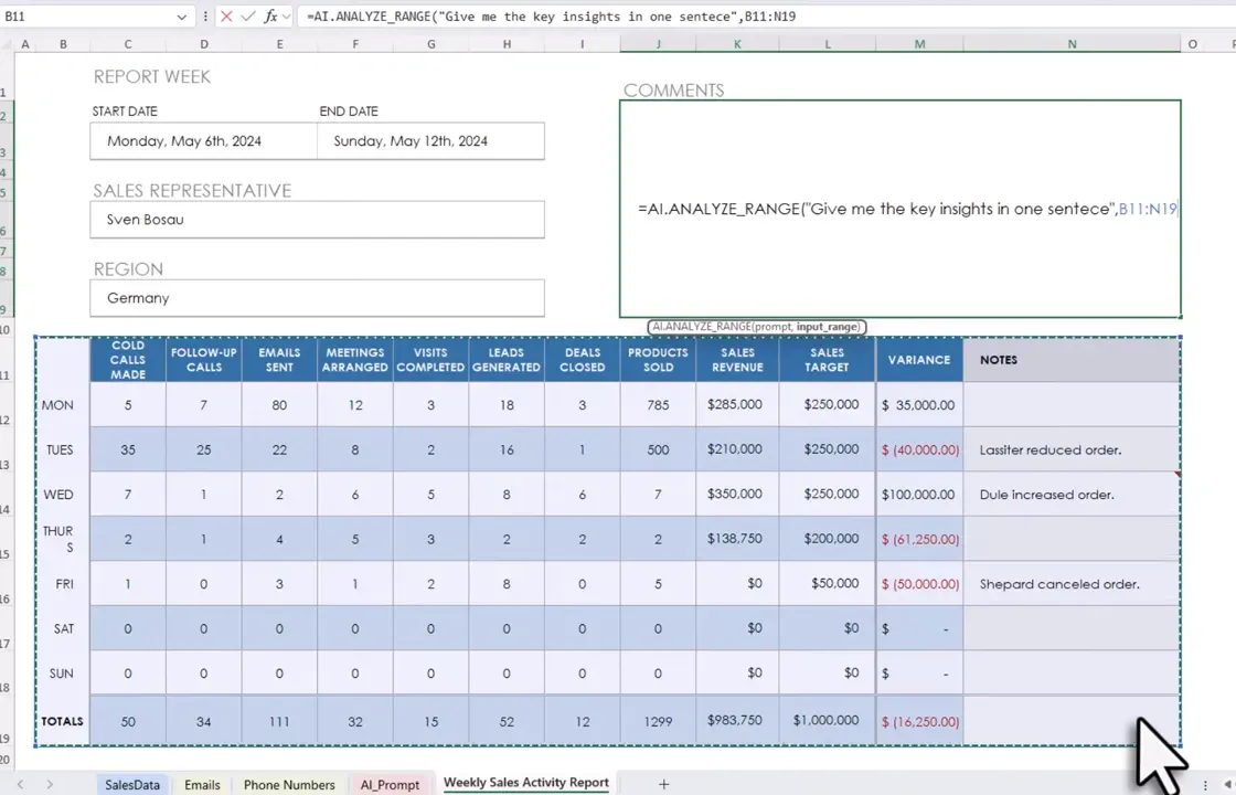 AIAnalyzeRange takes two inputs: a prompt like Give me the key insights in one sentence and the actual range to analyze. The function sends the data to the model and returns a concise summary. This turns a weekly sales sheet into an instant executive summary (handy when you are short on coffee and time).