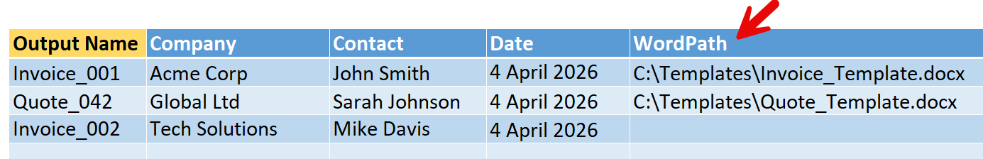- In each row, enter the full file path to the Word template you want to use for that row.