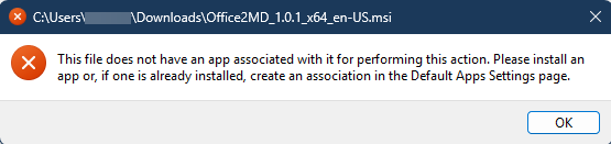 When you double click the Office2MD installer, Windows may show this error: