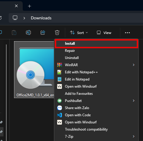 Office2MD_...x64-en-US.msifile. - Choose Install from the menu.