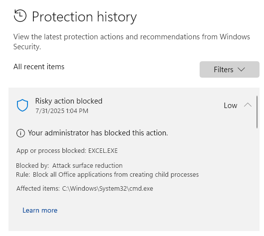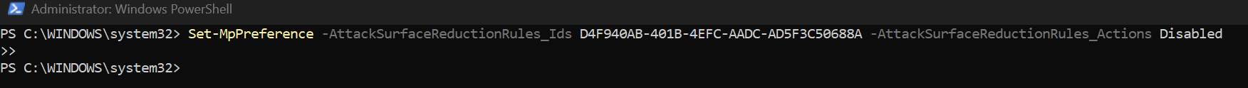Set-MpPreference -AttackSurfaceReductionRules_Ids D4F940AB-401B-4EFC-AADC-AD5F3C50688A -AttackSurfaceReductionRules_Actions Disabled