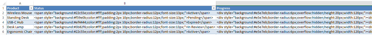 TablePop PRO can turn plain text in your Excel cells into beautifully styled content: status badges, progress bars, star ratings, images, and more. No coding needed. Use the Code Generator below to create styled elements, then paste them into your Excel cells.