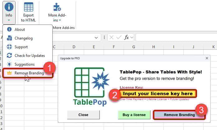 To activate your add-in, insert the license key into the TablePop add-in. See the screenshot below for guidance:
