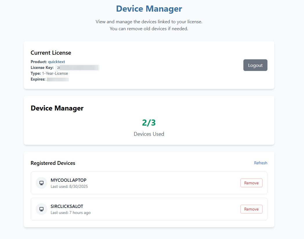 You can view and manage the devices linked to your license from the Device Manager.