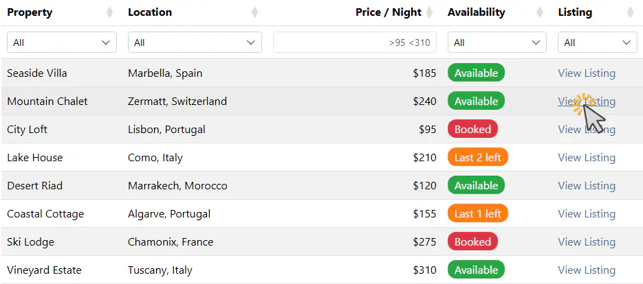Export any Excel table to a stunning, searchable HTML page in one click. Your audience can sort, filter, and search the data instantly. No coding required.